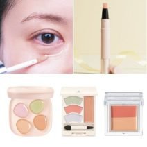 目元はBのaをアイホールになじませ、下まぶたにも全体にaを。上まぶたのキワはBのbで細く重ね、Eでキワ全体にラインを。DのハイライトはTゾーンと頬の高い位置にサッとのせ、Aのチークは頬骨に沿ってオン。リップは指づけでCをソフトになじませる。