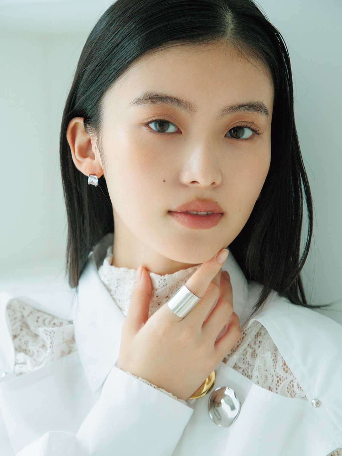 シャツ¥45,100(RYUGAKAWABE) レーストップス¥19,800(BELPER) 片耳ピアス¥13,200(e.m. 青山店〈イー・エム〉) ブローチ・ゴールド¥4,950、シルバー¥3,300(ロードス〈ieLS〉) リング¥25,300(ete bijoux)