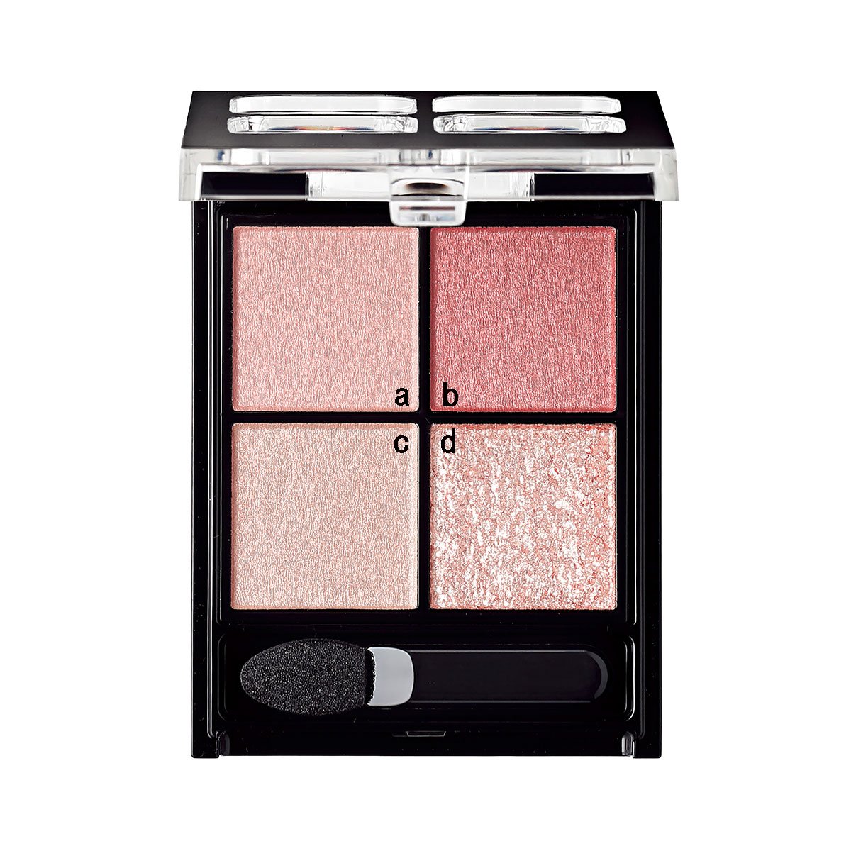 Aをパフにとったら厚塗りにならないように内フタか手元でファンデの量を調節してから、肌にたたき込む。アイホール全体にB-cを広げ、aをアイホール4/5に重ね、bを手の甲で濃さを調節してからアイホール1/2に入れる。B-bを上まぶたの目のキワに濃いめに入れ引き締める。B-aを下まぶた全体に入れ、涙袋のぷっくりとした部分にcを重ね、さらにその上からCを重ねて、B-bを手の甲で濃さを調節してから涙袋の影を引き、自然な涙袋を演出。