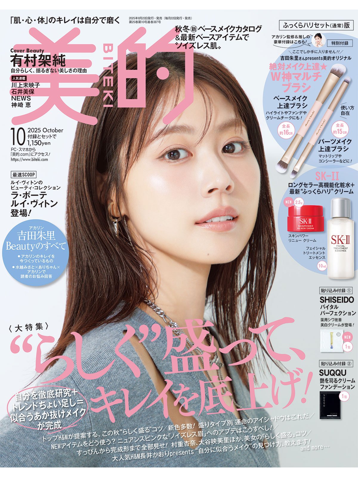 ’25年の「美的 ベストビューティウーマン」に選ばれた有村架純さんは、’25年は3月号と10月号の表紙に登場。特に人気だったのは、「飾らない美しさが引き立っている」(事務・26歳)という声が多い10月号。『美的』のYouTubeでは、表紙撮影のメイキングのほか、有村さんのバッグの中身も知ることができて人気です♪
