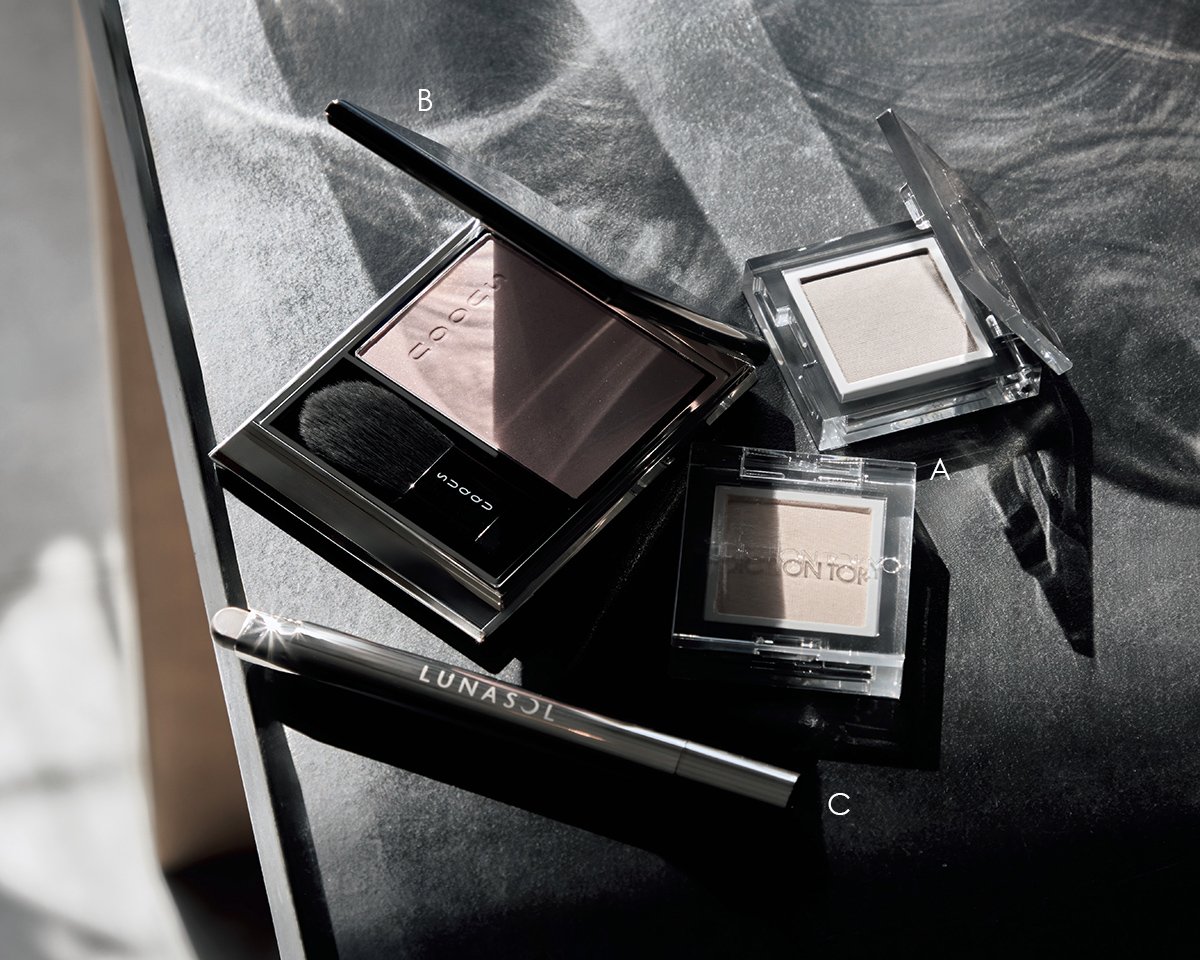 A. 大人のまぶたにもムラなくのびて粉っぽくならない。しゃれた陰影を与えるグレージュ(008M)と、洗練される黄みベージュ(002M)は必見。アディクション ザ アイシャドウ マット 上から/008M・002M 各¥2,200