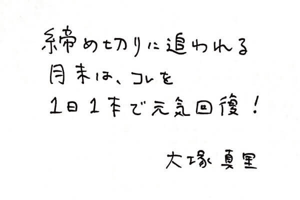 「味にクセがなく飲みやすいのと、さまざまな豪華成分配合で疲れが取れるのが魅力。飲むと元気になるので、寝不足が続くときの常備薬のような存在です」