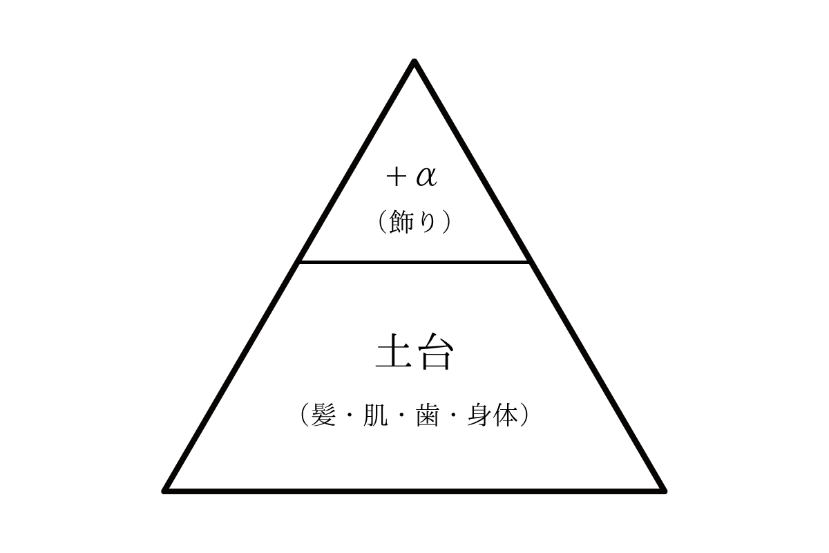 土台とはなにかというと、後からつけられるものではなく、 自分にもとからあるもので、「髪、肌、歯、身体」です。 ここをぴかぴかに磨いて最高の状態にします。そうすることにより、上にのせるメイクやジュエリー、ヘアアレンジ、服などをより美しく魅せることができるのです。そうすれば美容が、おしゃれが、もっと楽しくなります。