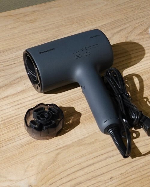 まずは、パナソニックを代表する存在ともいえるナノケアシリーズの最高峰ドライヤーから。今作の進化の核心は、やはり「高浸透ナノイー」。水分発生量が従来の18倍というスペックだけでも十分すごいのですが、実際に使ってみると、これがただの数字じゃない。体感として違うんです。髪って、うねりや広がりが気になるとき、つい「クセが強いから」「湿気が多いから」で片づけてしまいがちですが、実は髪内部の水分バランスが不均一なのも大きな原因のひとつらしく。このドライヤーは、微細なナノイーがキューティクルの隙間から内側まで入り込んで、水分を均一に整えてくれる設計になっているので、髪をただ乾かすのではなく、乾かすほど髪が落ち着いていく感覚があります。いつもなら乾かした後に、ブラシ通しておこうかな?となるところが、乾かし終わった時点でまとまっている。ドライヤーでこんなに仕上がり変わるの?と改めて思わされました。そして今回の注目ポイントが、新搭載のナイトキャップノズル!これがまた優秀で、ノズルをつけると3種類の風がやさしく髪を包み込みながら、全体をほぐして整えてくれるんです。ただ風を当てるのではなく、くせをのばしながら、髪の流れをきれいに作るように乾かせる感覚。翌朝、寝ぐせの収まり方が本当に違いました。しかも軽量で、シリーズの中でも風量が強いのに、熱くなりすぎない。毎日使う家電って、結局こういう続けやすさがものを言うと思っているので、そういった意味でもかなり優秀です。
