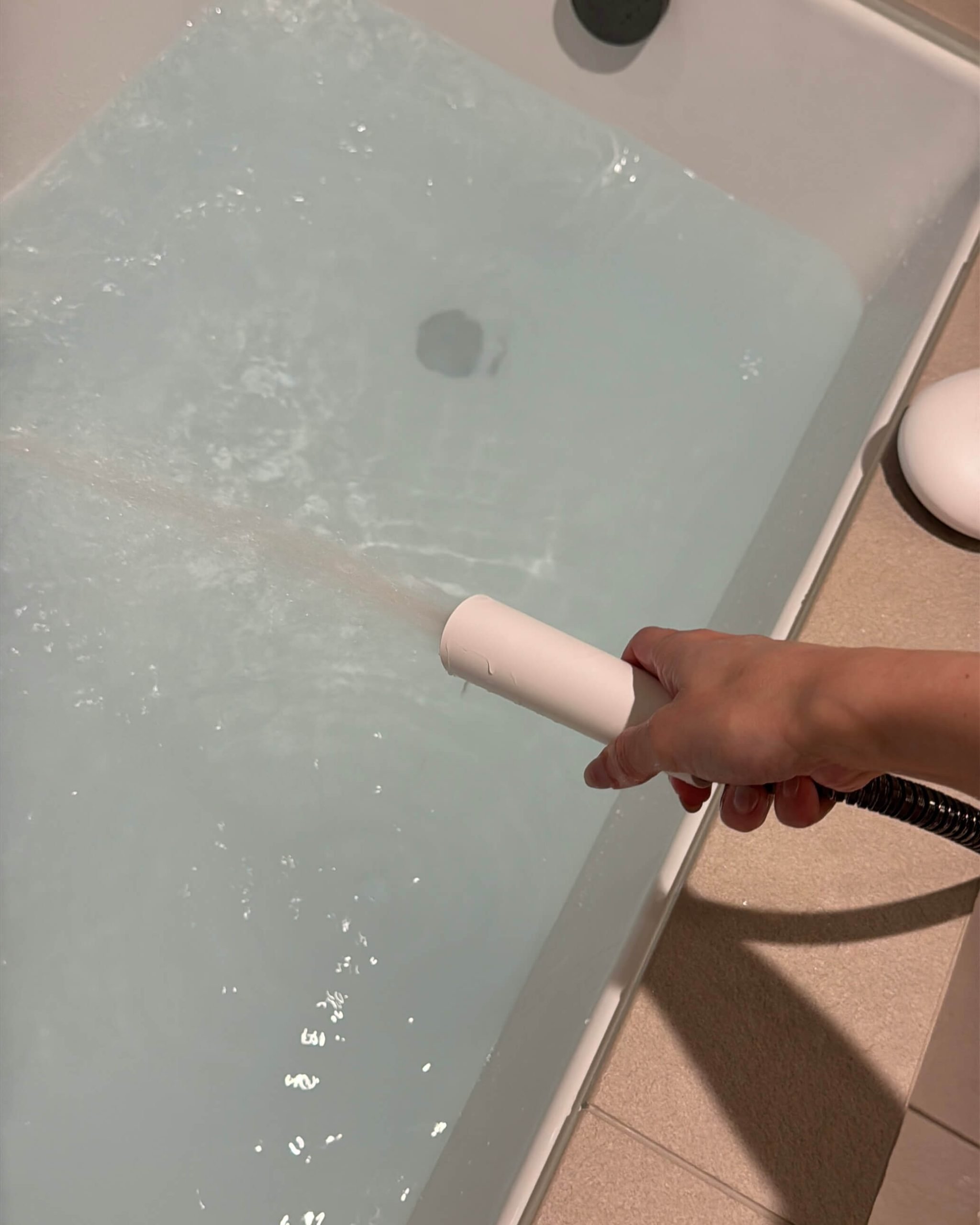 今回、かなり衝撃だったのがこのシャワーヘッド。正直に言うと、最初は「シャワーヘッドね〜はいはい。」くらいに思っていました。ごめんなさい。全面的に撤回します。実は私、普段別ブランドのシャワーヘッドを使っているのですが、そんな私でも、これすごい!と思ったのがこの一台。しかも開発期間はなんと5年。本気度が違う・・!使い方のポイントは大きく分けて2つ。まずはプレシャンプーモード。これがとにかく気持ちいい。水流がしっかり力強くて、手でゴシゴシしなくても頭皮に届く感じがあるんです。届かないところに手が届くって、こういうことか、と。頭皮をかき出すような感覚で、まるでヘッドスパを受けているみたい。シャンプー前の段階で、すでにかなり満足度が高い。シャンプーの泡立ちも良くなって、洗い上がりのスッキリ感も違う。頭皮ケアをちゃんとすると、その後の髪の仕上がりまで変わるのを体感できました。そして次がヘアケアモード。ファインバブルがカルシウムイオンを吸着して、トリートメントが髪全体になじみやすい状態に整えてくれる設計になっているそうで、これがまた面白い。泡切れがいいのも地味に大きなポイントでした。