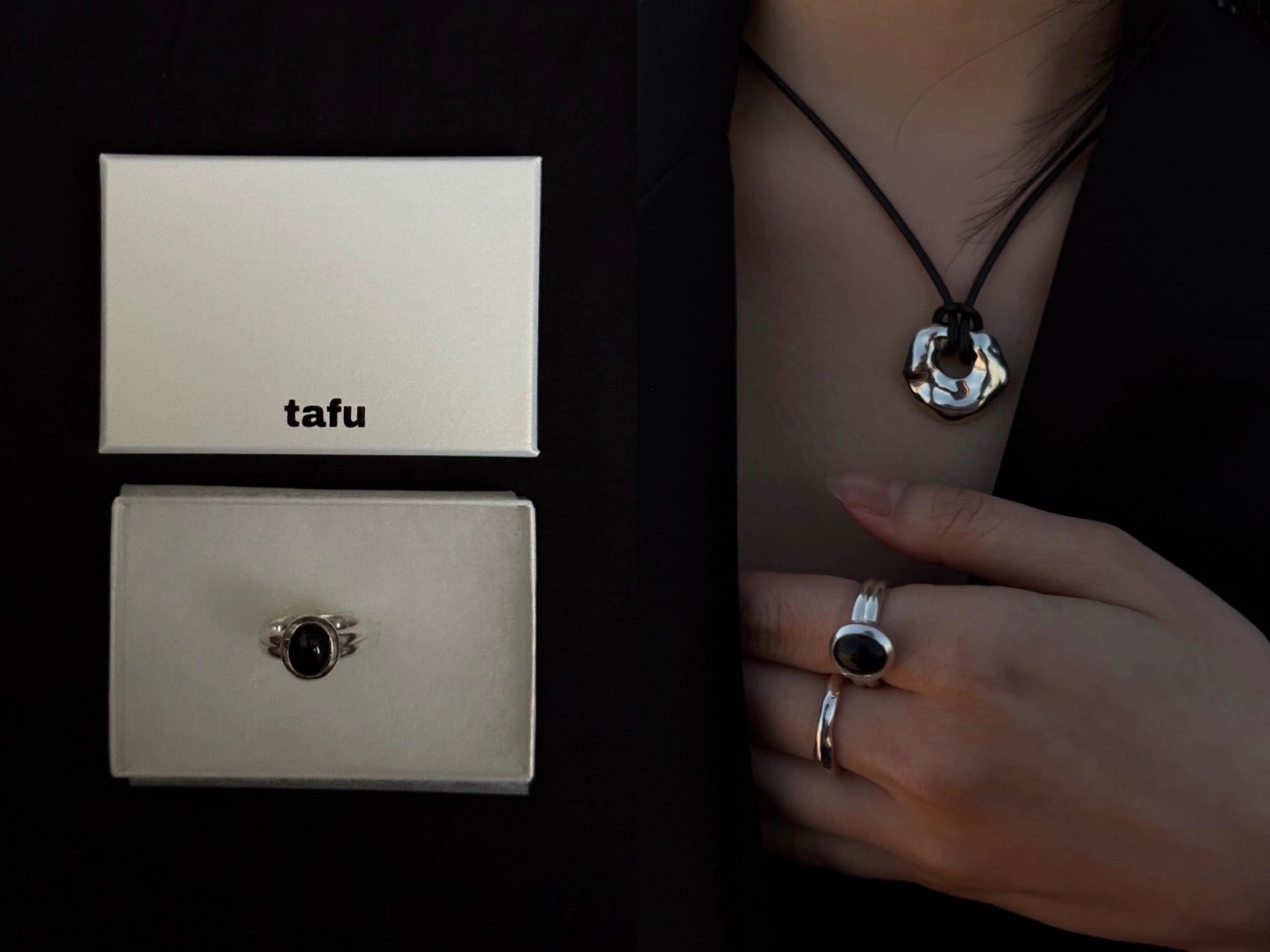 1st collectionのアイテムです。onyx ring(左)、motif necklace、melt ring(右)