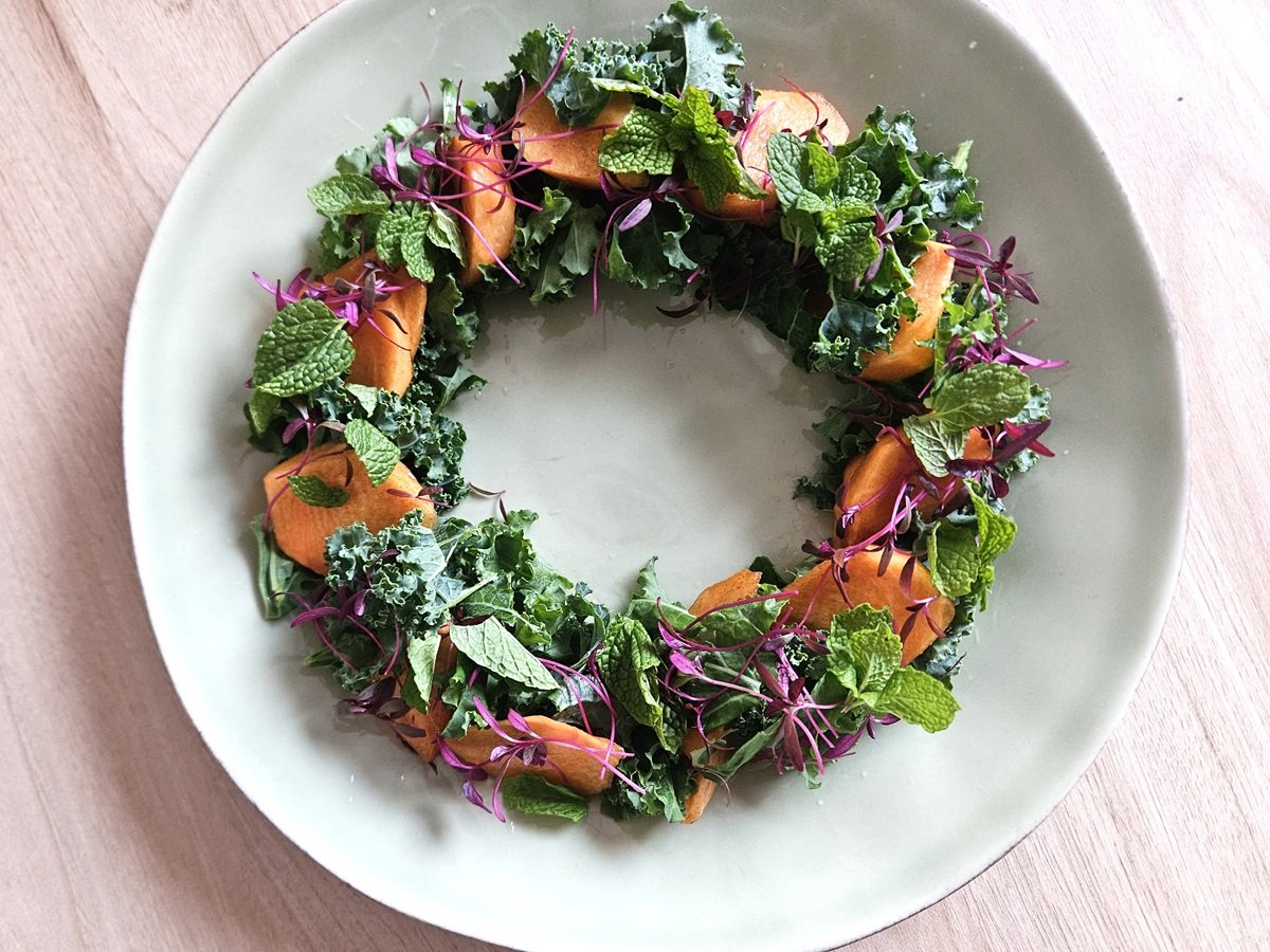 【画像】美容にもイイ、クリスマス気分を盛り上げるサラダ「ケールと柿とミントのリースサラダ ヨーグルトドレッシング」【Today’s SALAD #346】