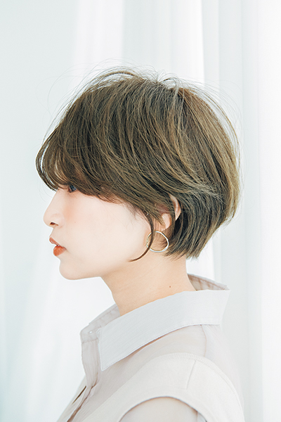 ローレイヤーでカットしたショートスタイルがベース。前髪は長めのウザバングに。えり足は、丸みのあるフォルムに対して、程よく締める長さでカットします。