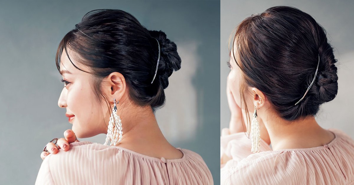 本気の夜会巻きではなく、カジュアルな雰囲気なのはくるりんぱをベースにしているから。毛束を横から通すのがコツ!シルバーコームをあしらえば、たちまちお呼ばれ風ヘアに。