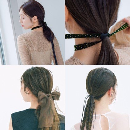 「リボンひとつで気の利いた雰囲気になります。結び目にシンプルに結ぶだけでもいいですが、毛束にぐるぐると巻きつけると、おしゃれ上級者っぽく見えますよ。この場合はリボンを長めに用意しておくといいかもしれません」
