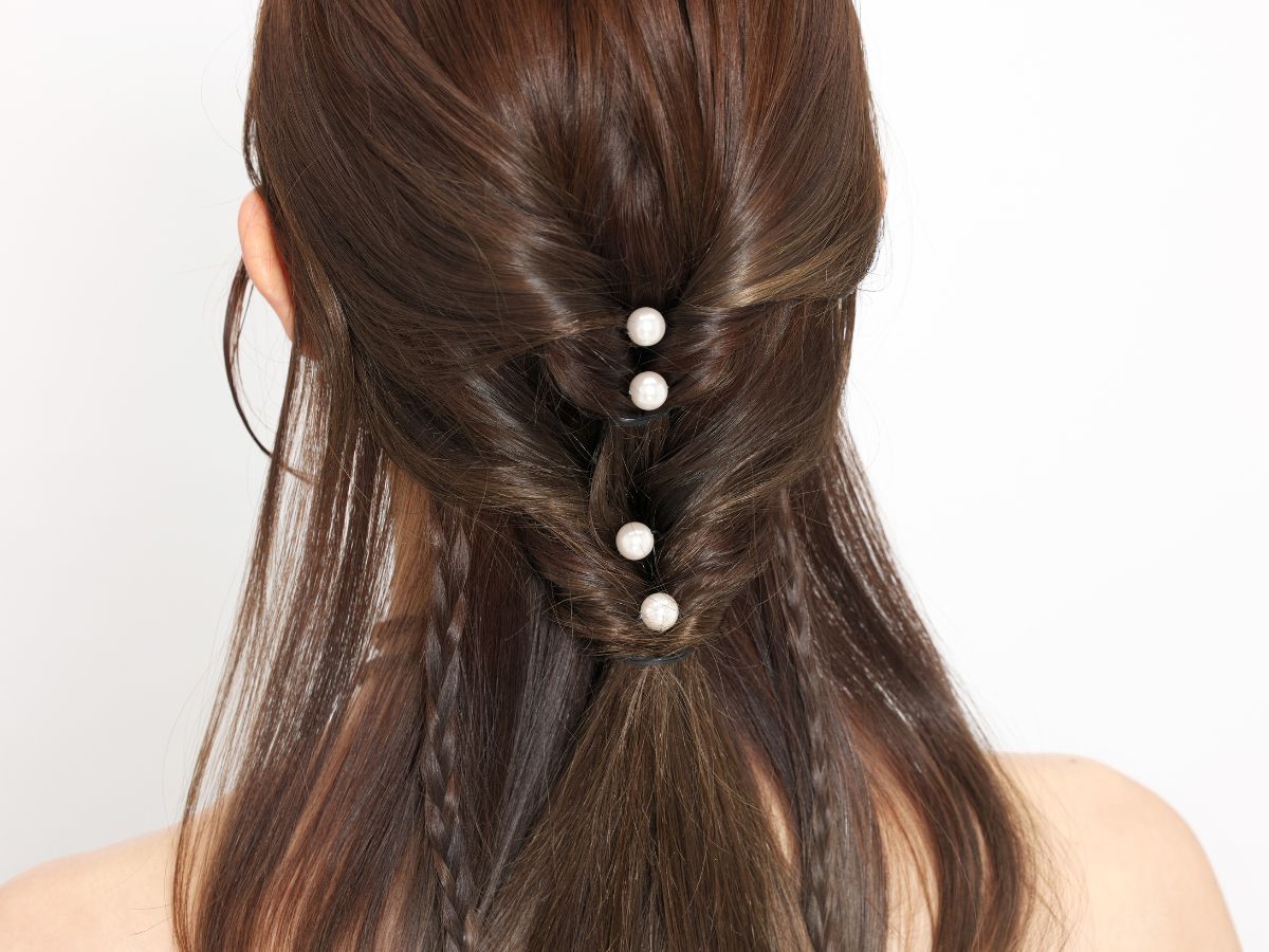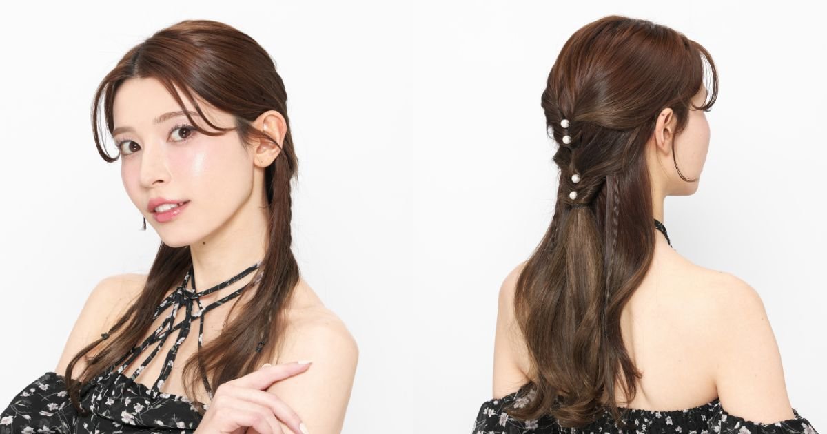くるりんぱのハーフアップに三つ編みとパールでトレンド感をプラス!