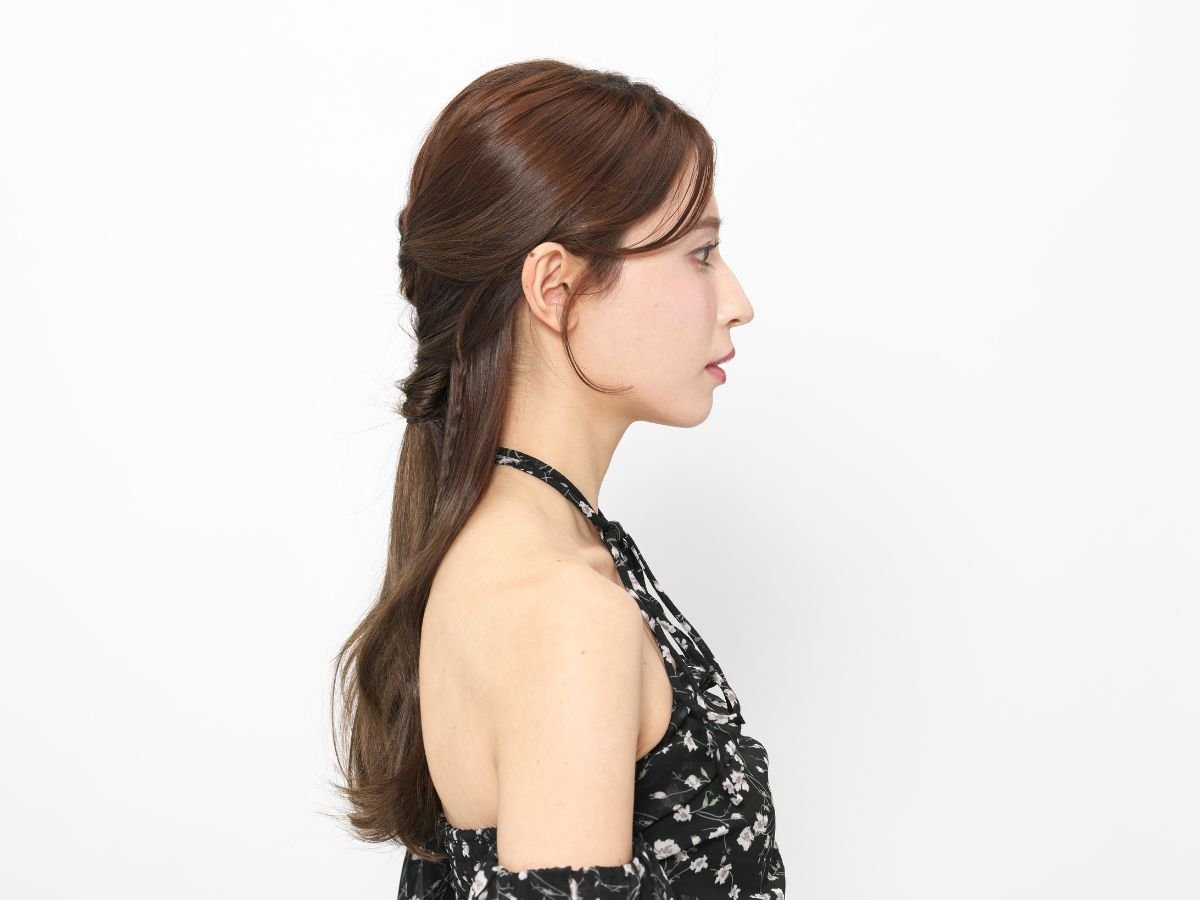 ハチ(頭の横のいちばん張っている部分)のラインでハーフアップを作り、くるりんぱにします。