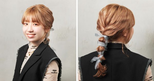 リボンひとつで気の利いた雰囲気になります。結び目にシンプルに結ぶだけでもいいですが、毛束にぐるぐると巻きつけると、おしゃれ上級者っぽく見えますよ。この場合はリボンを長めに用意しておくといいかもしれません