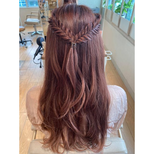 左右のフィッシュボーンを均等につまんでゆるくほぐしてから、2本のフィッシュボーンを後ろにもっていき、1つにしてハーフアップのように結びます。