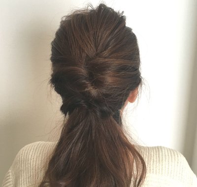 ・基本の「くるりんぱ」した後、もう一回転するように毛先を入れ、結んでいるゴムに挟む。