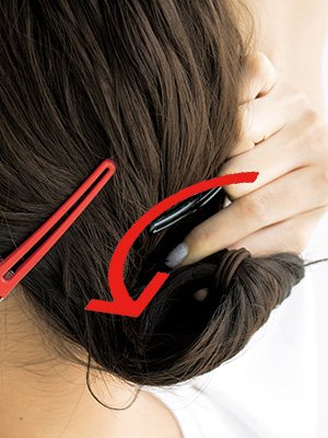 ・ゴムの結び目より上にバレッタで留め、ゴムは抜き取る。