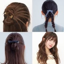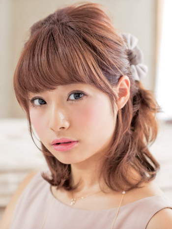 顔周りの後れ毛を1束出し、トップの毛束を引き出しながらボリュームを加える。