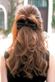 結び目を片手で押さえながら、トップの髪を少しずつつまみ出して、高さとニュアンスを出す。最後に、結び目の上にリボンバレッタをつけて、完成。