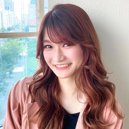 カットは、セミディで顔周りにレイヤーを入れ、くびれるようにカットしてスタイリングしています。毛先も揃えることで巻いたときに厚みと立体感が出るので韓国髪になります。カラーは、7トーンのほんのり赤みを入れた落ち着いたベリーピンク。顔色をよく見せてくれて、ベージュ系のカラーと混ぜているので、ブルべ肌と相性がよく、きれいな色が出てくれるので人気のヘアカラーです。