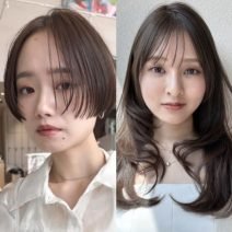カットベースは、あご下3cmのワンレングス。毛先の毛量調整はせず、厚みをあえて残します。前髪をリップラインくらいでカットし、レイヤーを入れて抜け感を加えます。ほお骨にかかる長さで、骨格を補正も叶えます。