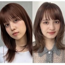 ヘアカラーはオレンジっぽさをおさえたベージュカラーで透明感をプラスして。前髪は長めにすることで前髪ありでも幼く見えず、大人っぽい雰囲気に。また、長めバングは面長さんの補正にもぴったりです。