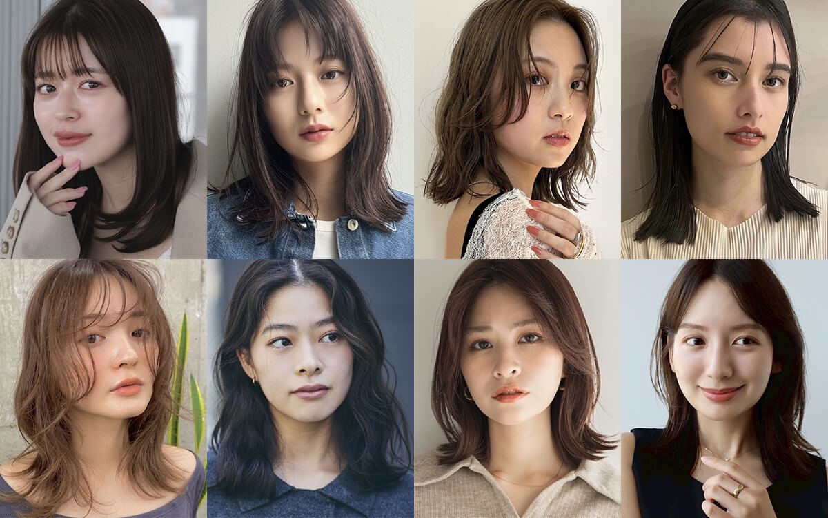今トレンドの顔周りレイヤーをはじめ、全体のフォルムや前髪あり・なしなどによっても仕上がりの印象が変わるミディアムヘア。