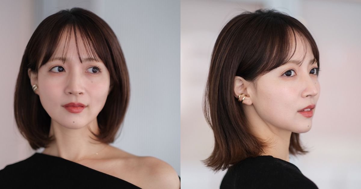 カットベースはあご下5cmのワンレングスボブ。表面にしっかりめ、顔まわりは少しだけレイヤーを入れて軽やかな動きを出しやすくします。シースルーバングは眉下でラウンドに。