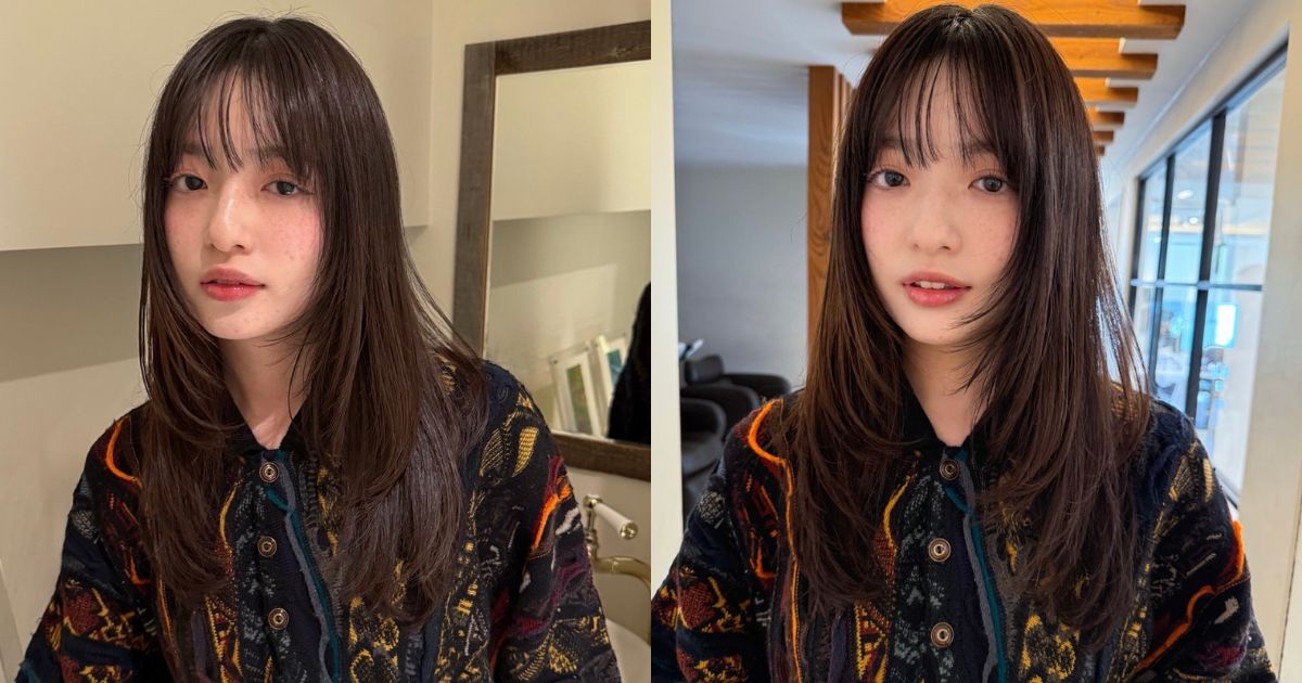 前髪はややワイドバングにするのが今どき。結んだときにこめかみ部分にすき間ができないのも嬉しい。ヘアカラーは、赤みをおさえたいけど、くすませたくないという人はニュートラルカラーがおすすめ。チェスナットブラウンは、レイヤーの柔らかい動きとも好相性です。