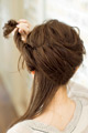 3.ねじって折った髪を、1の結び目あたりに別のゴムでざっくりと留める。