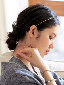 1.カチューシャをつける。トップを手でつかみ空気を含ませるようにして、頭の低い位置で一つにまとめてゴムで結ぶ。