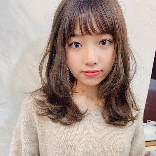 韓国でも人気が広がってきているぱっつん重め前髪と、もみあげにアクセントをつけたセミロングのレイヤースタイル。アウトラインは前上がりにカット。パーマをかける場合は26〜29ミリのロッドでデジタルパーマで1.5回転の外ハネワンカールがオススメです。