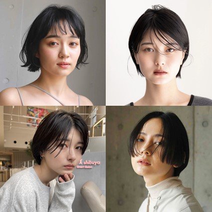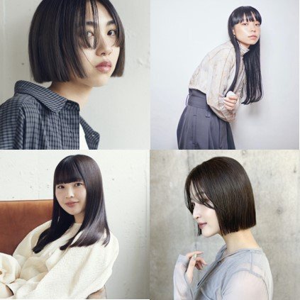 ベースは、あご下レングスのミニボブ。中間からグラデーションをつけて柔らかい動きを出しやすくします。トップには、少しだけレイヤーを入れます。前髪は、眉の長さでぱっつんとしたライン感を出します。