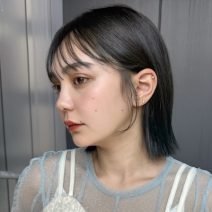 ベースを胸上で前上がりのワンレングスにカットし、ローレイヤーを入れる。前髪はリップラインとアゴの中間くらいの長さで、幅と奥行き共に厚めにカット。前髪にもレイヤーを入れ、スライドカットで調整。ひし形シルエットを作る。前髪をこめかみあたりまでつなげることで、サイドとの馴染みがよくなり小顔見せにも。カラーリングは6レベルのアッシュベージュに。クールな印象を与える寒色系の色味で、大人女性なニュアンスをプラス。
