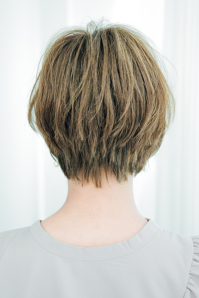 基本的には乾かすだけでOKという手軽さが嬉しいショートスタイル。キレイに仕上げるコツは、乾かす時に分け目がつかないように注意し、根元が自然と立ち上がるように、毛流れとは逆方向からドライヤーの風を当てます。スタイリング剤は、オイルとクリームをミックスし、根元から空気を含ませるようにボリュームを出しながら塗布。最後に整えたら完成です。