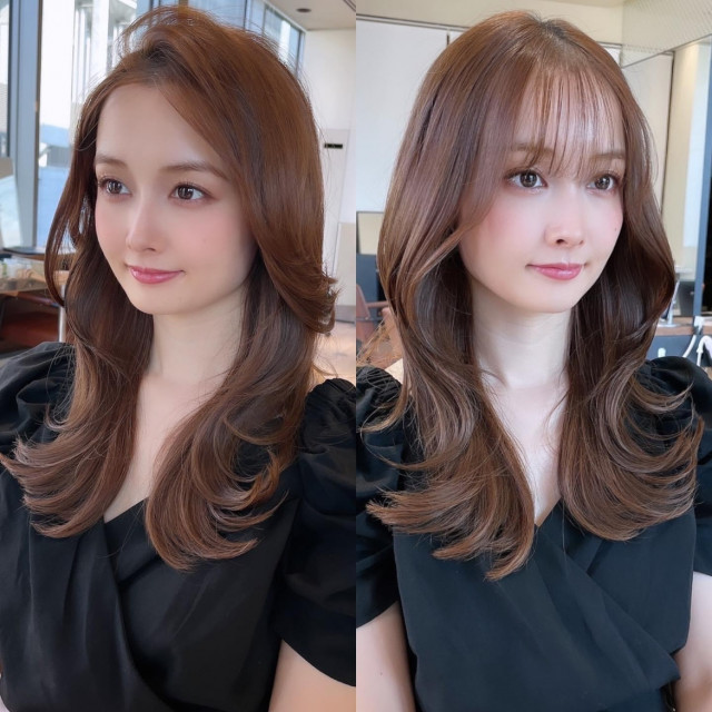 前髪は、シースルーもできる2WAYバングに。年齢問わず、お洒落ヘアを楽しめるレイヤーミディ。エアリー感のある柔らかい表情を求める人や、丸顔をカバーしたい人におすすめです。
