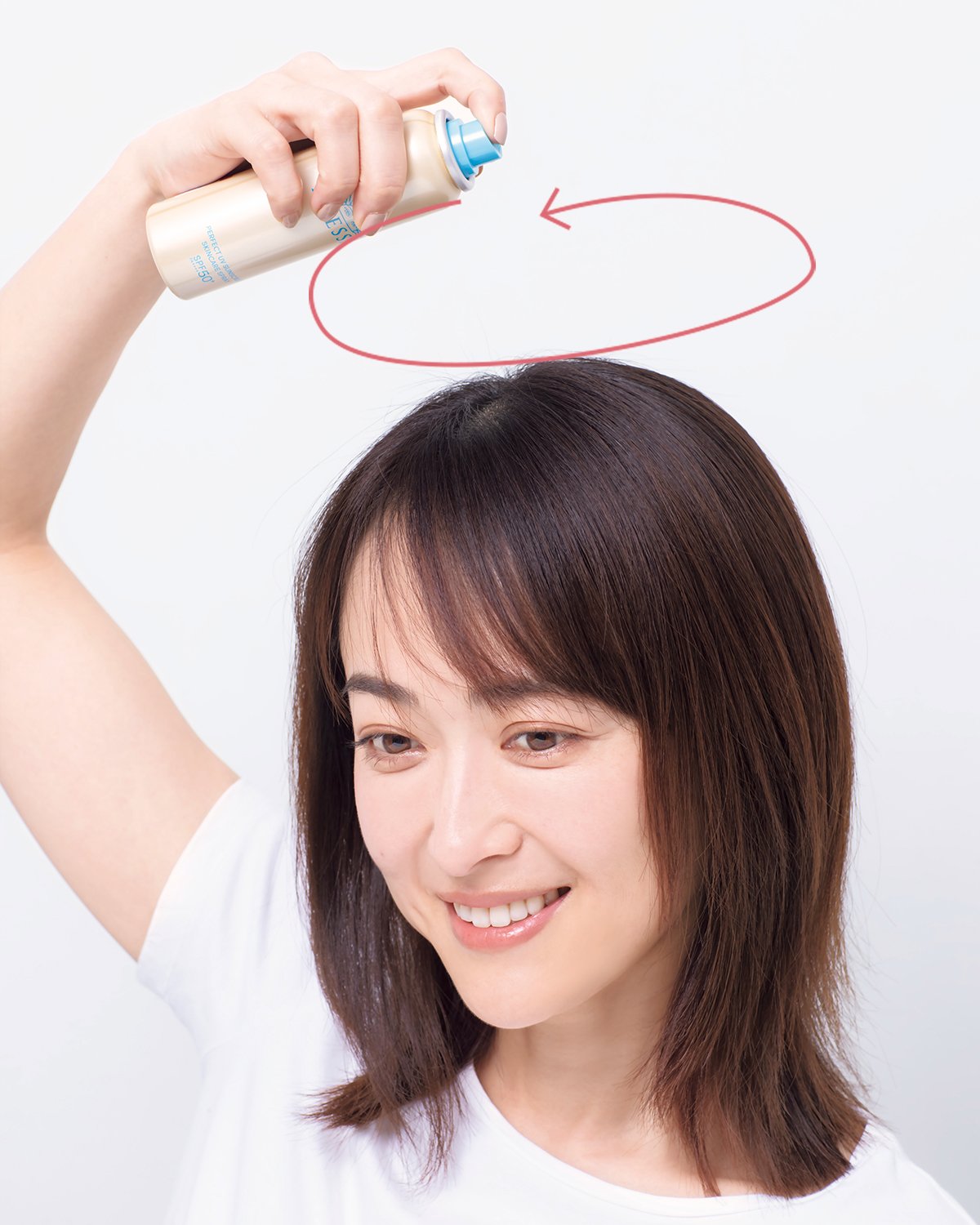 スタイリングが終わったら最後の仕上げとして使用。紫外線が当たりやすい頭頂を中心にぐるりとまわしながらシューっとかける。