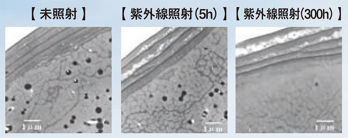 左は毛髪断面の拡大写真。紫外線未照射の髪(左)にはキューティクルの間に白い空洞がないが、紫外線に当たる時間が増える程、白い空洞が増え、もろくなっていくことがわかる。資料提供/岩渕徳郎教授