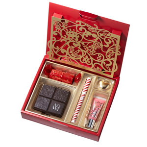“King of Sweets”をテーマに、かわいらしいスイーツをモチーフにしたコスメデコルテのメークコフレ。チョコレートのようなアイシャドウパレットは、ふんわりニュアンスのブラウン系グラデーション。包み紙をそっと開けば、上気した肌を演出するスティックタイプのチークがお目見え。ブラウン系のジェルアイライナーとピンクのグロスもセット。