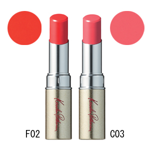 F02の黄みがかったチェリーレッドは、ラフに塗ってヘルシーに仕上げるのがおすすめ。C03は明るくジューシーなピーチピンク。