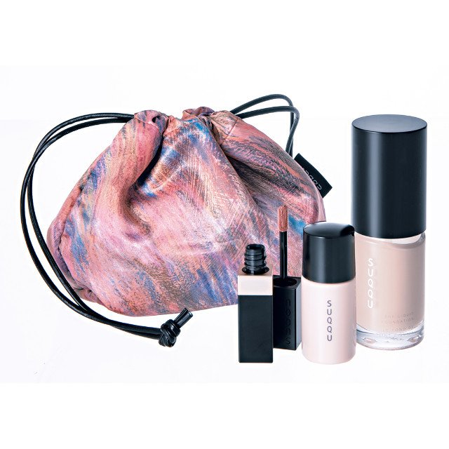 全6種のファンデーション(レフィル可)から1品を購入。さらに¥2,200支払うと、素肌感を作るプライマー&赤みベージュのリキッドリップ(ともにミニサイズ)、ポーチがセットに。ポーチと外箱のデザインは、アーティスト・高橋南さんの作品「風のロンド」が反映されている。
