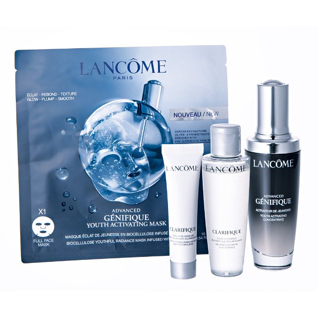約2か月分たっぷりと使える、ブランド内人気No.1美容液「ジェニフィック アドバンスト N」の50mlを購入。すると、新次元の透明肌を目指せる“クラリフィック”シリーズの化粧水&乳液(ともにミニサイズ)、“ジェニフィック”のシートマスク(1枚)がついてくる。