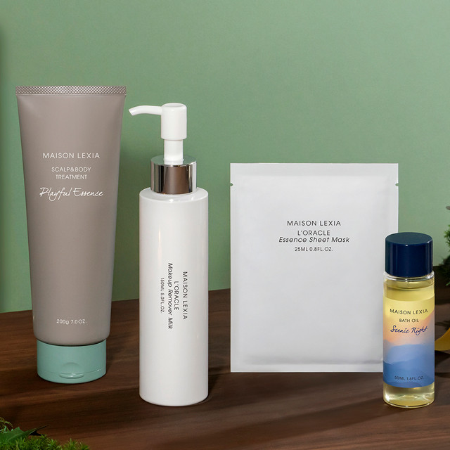 <髪も肌もエイジングケア>をかなえる欲張りなバスタイムコフレが登場。ボディケアに使ってもOKな新発想の頭皮用トリートメントと、マッサージクリームとしても使えるメイク落としの現品のほか、シートマスク、バスオイル(非売品)の4点をセット。贅沢なテクスチャーと植物の香りで、乾燥やストレスで硬くなった肌と心を柔らかくほぐします。