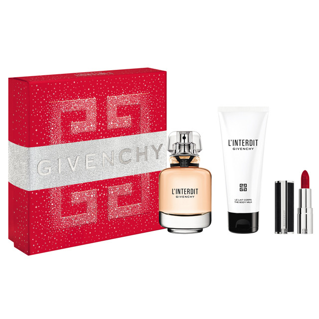 フェミニンな香りのホワイトフラワーと、ダークな香りのアンダーグラウンドがブレンドされたジバンシイの名香「ランテルディ オーデパルファム」の現品がメイン。フレグランスと同じ香りのボディミルク、鮮やかな発色と潤いが続くリップ「ルージュ・アンテルディ・シルキー」のミニサイズをセットに。フレグランスとボディミルクはレイヤリングすることで、より奥行きのある香りが楽しめます。