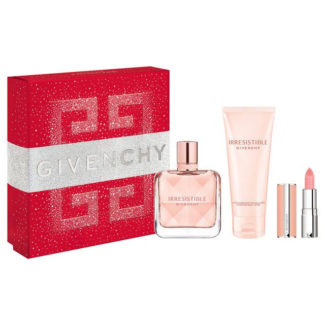 華やかなローズをブロンドウッドが包み込む、フェミニンな香りが特徴のフレグランス「イレジスティブル オーデパルファム」の現品と、同じ香りのボディローションがセットに。さらに、メイクアップとしての発色はもちろん、唇を潤しケアする人気のリップ「ローズ・パーフェクト」もイン! ジバンシイを代表するアイテムを全身で楽しめる、特別なキットです。