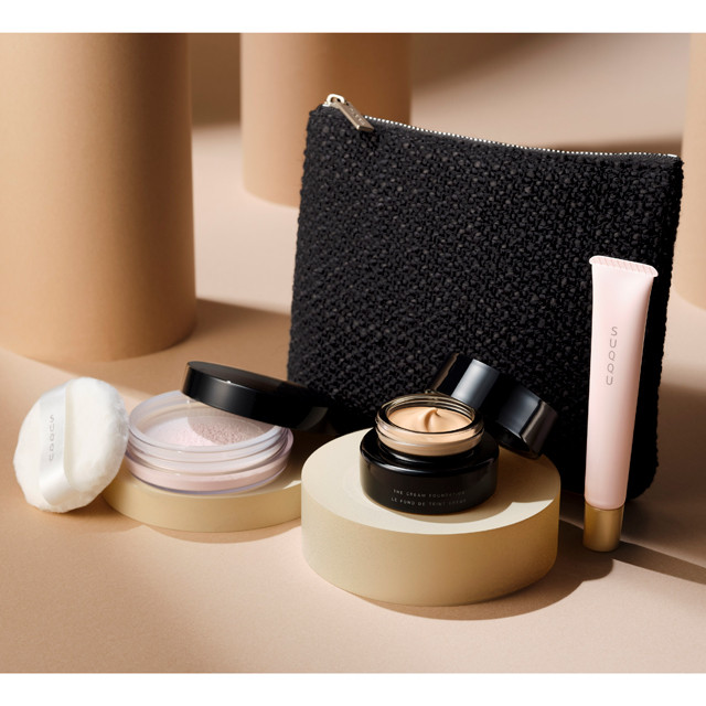 時間とともに移り変わる美しいツヤ感で人気のファンデーション「ザ クリーム ファンデーション」のハーフサイズをはじめ、補正効果のあるプライマー、マットな仕上がりのフェースパウダーをセットに。高貴で上質な肌を作るベースメイクキットです。ポーチの素材には、世界 3大毛織物産地のひとつである<尾州地域産>の再生ウールを配合。