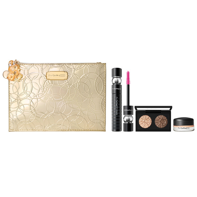 クリームアイシャドウ、2色パレットアイシャドウ、マスカラをセットにしたコフレが登場。ベージュのクリームシャドウでまぶたの色ムラを整え、ベージュ×ブラウンの2色で陰影をプラス。仕上げにボリューム、ロング、カールのすべてをかなえるブラックマスカラで、フレームを強調して。バブル柄のエンボスが施された、ゴールドのポーチもゴージャス!