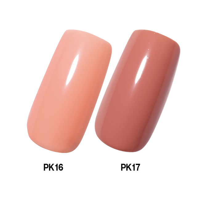 ひと塗りでなめらかな仕上がりに。爪の形に合わせたフラットなラシも◎。CR05は上品なコーラル。PK17はヌーディピンク。