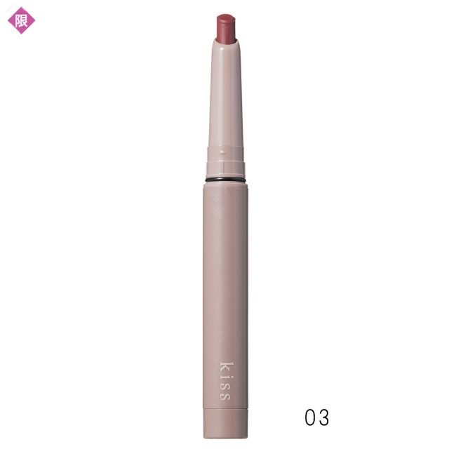 内側からにじみ出るような血色を生むくすみカラーのセミマットリップ。斜めカットで輪郭を描いて、面で全体を塗るとぷっくり唇に。