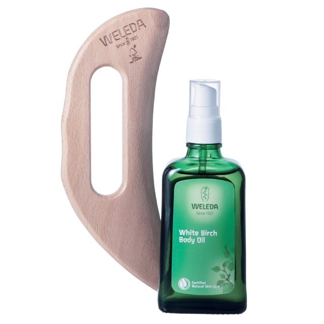 グレープフルーツの香りのボディオイル(現品)と、木製カッサのセット。アンズ核油やシラカバ葉エキス、ナギイカダ根エキスなどにより、しなやかなハリ肌へ。肌表面を流すのはもちろんのこと、ツボを押したりたたいたりできるカッサを併用すれば、最短でメリハリボディへと近づける。