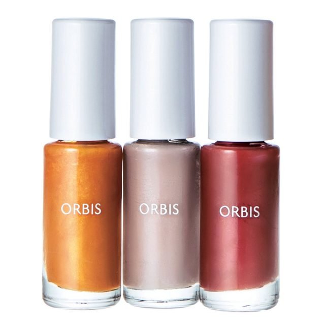 ネイルの夏の新色は、コーラルレッド(右・サンベイズ)と、限定色のピンクグレージュ(中・モーニングサン)・オレンジイエロー(左・シャイニーデイ)の太陽のエネルギーを想起させる3色。